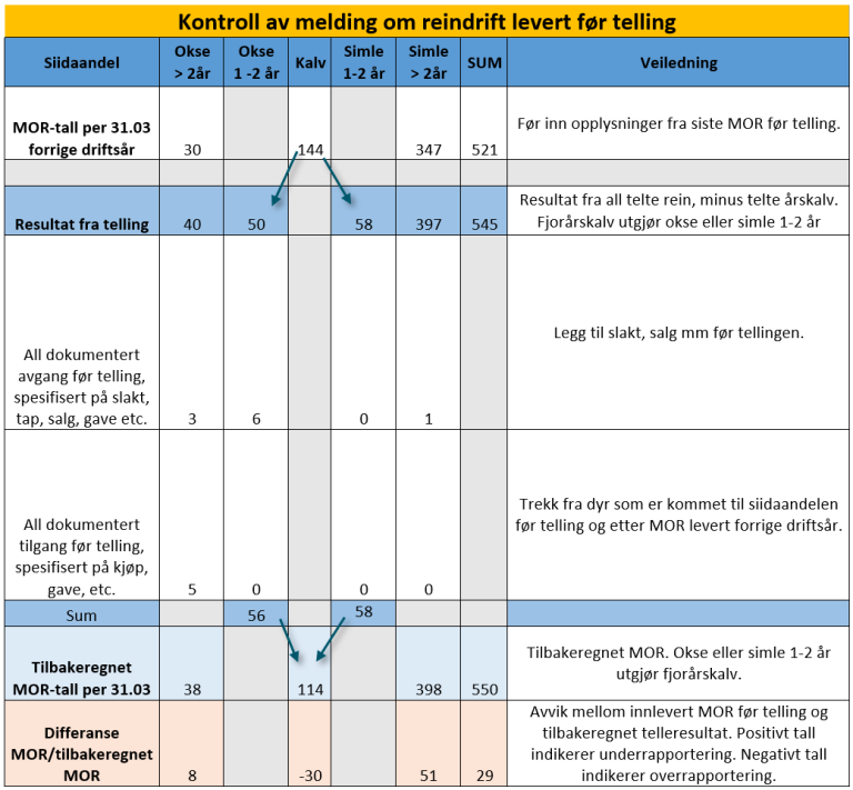 Tilbakeregnet MOR og stipulert MOR vil kunne indikerer om reintallet i innleverte melding om reindrift er riktig. Det kan både indikere:
