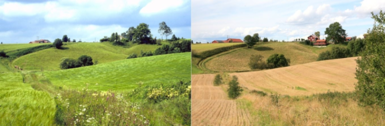 Bildene over er tatt med ti års mellomrom (1998 og 2008) og viser et ravinelandskap i Trømborg, Eidsberg kommune i Østfold. Selv om landskapet stadig endrer seg og nye bygg har kommet til, har kvalitetene blitt ivaretatt. Det er dette kjerneområde landbruk dreier seg om. Målet er ikke å konservere, men sørge for at landskapets verdier og egenart blir bevart (Fotograf: Oscar Puschmann, NIBIO).