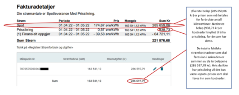Døme på faktura til eit føretak med prissikring, og utfylling av straumforbruk og utgifter i søknadsskjemaet: